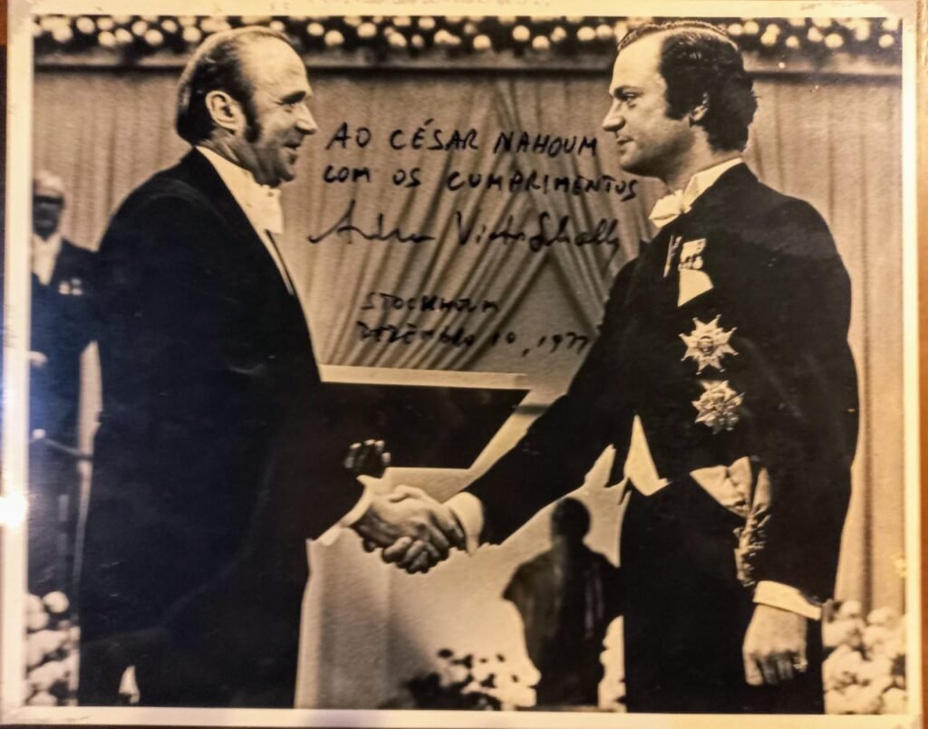 Como prova de seu reconhecimento internacional, Andrew Schally, Prêmio Nobel de Medicina em 1977, enviou esta foto por toda a colaboração para a causa coordenando pesquisas na Fundação das Pioneiras Sociais, RJ-Brasil.