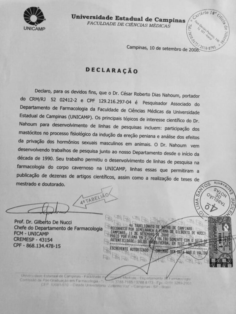Pesquisador Associado do Departamento de Farmacologia da Faculdade de Ciências Médicas da UNICAMP-SP desde 1991, Dr. Nahoum sempre foi voz corrente sobre o assunto, tratando-o com seriedade e respeito. O documento ao lado é a declaração do status de pesquisador da universidade, emitido em 2008.